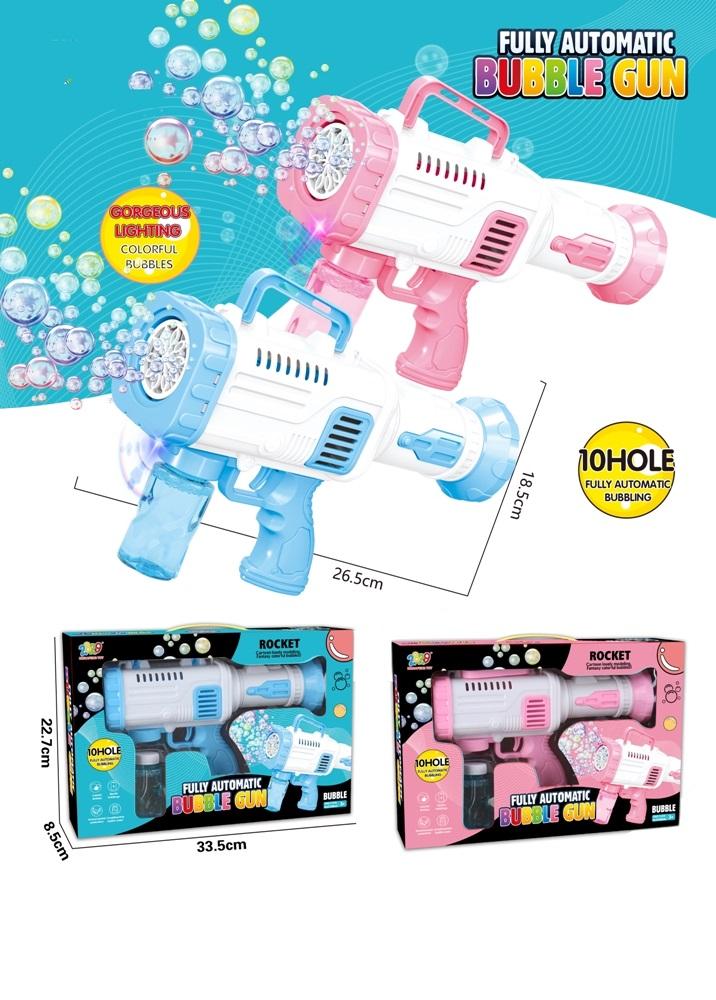 تتضمن المجموعة مسدسين (أزرق وزهري)، مع زجاجتين من محلول الفقاعات .